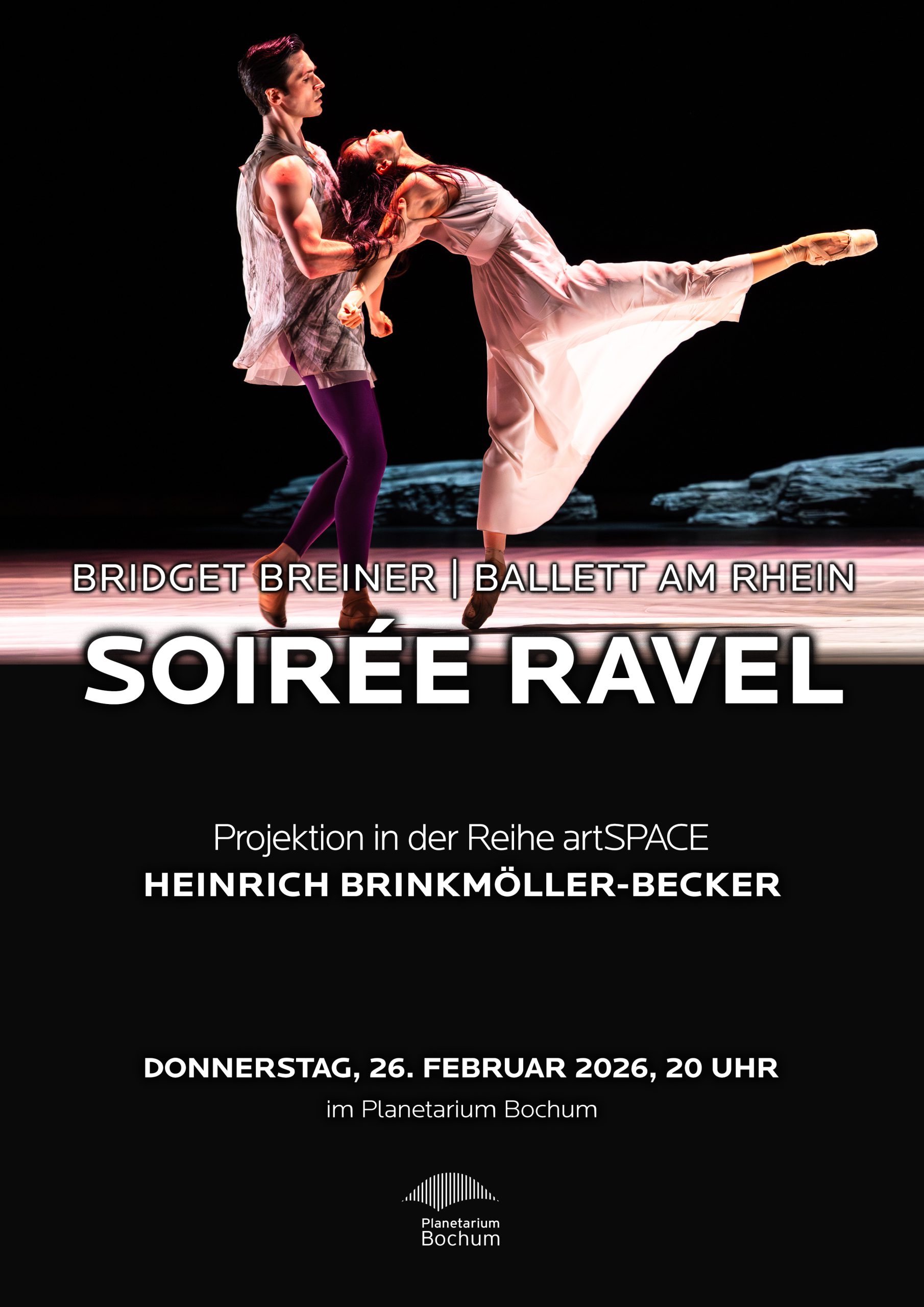 „Ballett immersiv“ dokumentiert die erfolgreiche Choreographie von Bridget Breiner mit dem Düsseldorfer Ballett am Rhein: die Uraufführungen „Konzert für die linke Hand“ und „Daphnis et Chloé, Suiten“ im Rahmen der „Soirée Ravel“. Anlass des vielbeachteten Ballettsist der 150. Geburtstag Maurice Ravels. Die Projektion im Planetarium zeigt die Vorbereitungen, Proben und die Aufführung des Balletts und gibt einen Einblick in den Entstehungs- und Umsetzungsprozess einer Tanz-Kreation.